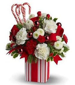 Brighten anyone’s holiday with this festive and fanciful Christmas bouquet of peppermint candy cane white and red colored carnations carnations, ornaments, holly, and candy cane accents in a striped red and white gift box