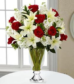 Our Luxurious Occasion Flower Bouquet is the perfect way to add sophistication and elegance into any celebration. Rich red roses collide with white stock and brilliant white Asiatic Lilies, accented with lush greens. Arranged in a clear glass vase with a gleaming metallic silver pedestal, this bouquet turns an ordinary day into an occasion of its own.
